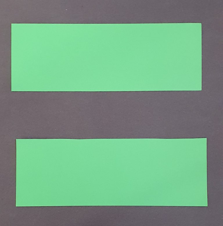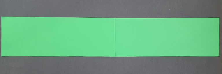 Cut a sheet of green A4 paper in half horizontally and glue together with a 2cm overlap to make a long strip like the image below. This is the headband. Put the strip around your head to see if it fits. You may need to add another strip if it doesn’t fit.  Keep aside.