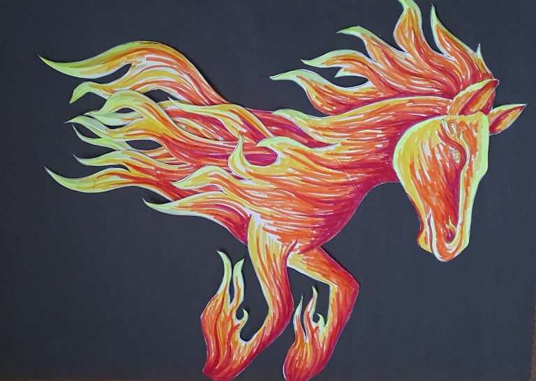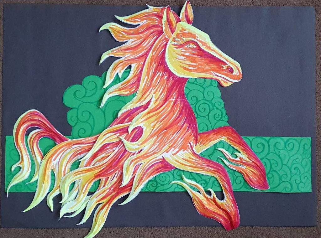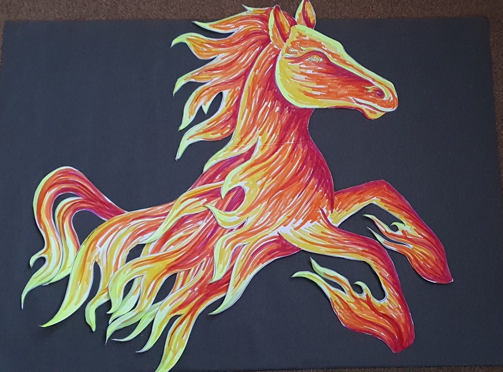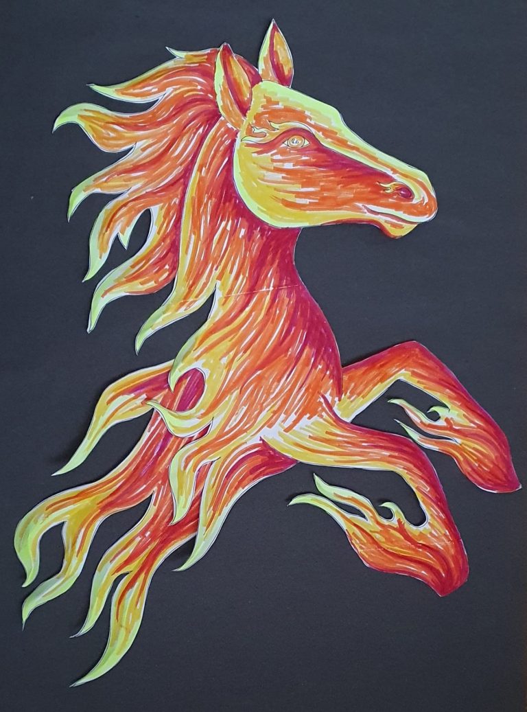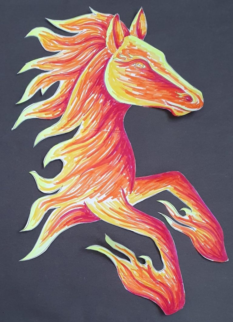 2d. On the sheet that you have joined, draw, colour and cut out a horse head and front legs finishing off with flames at the end. You can add additional flames around the eyes, nose, hooves if you would like. This is the main horse shape.