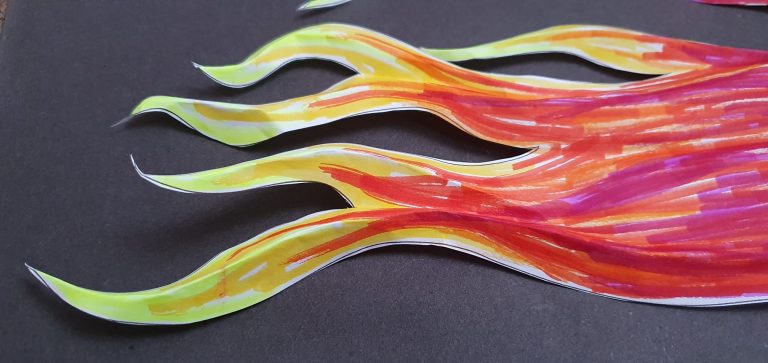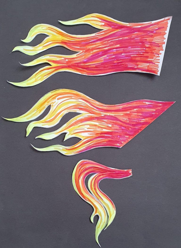 3d. Take all the flame shapes and bend the ends of them in the middle following the curves so they start to look 3D as in the picture below.  Do not glue down the bottom of the legs or the edges of flames as you want these to stand out from the green back ground use the images below to guide you.
