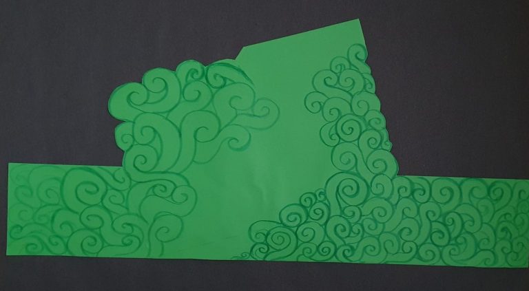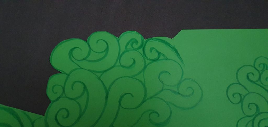 4b. Using a dark green colour pencil or marker, draw some Chinese patterns all over, I chose Chinese swirls.